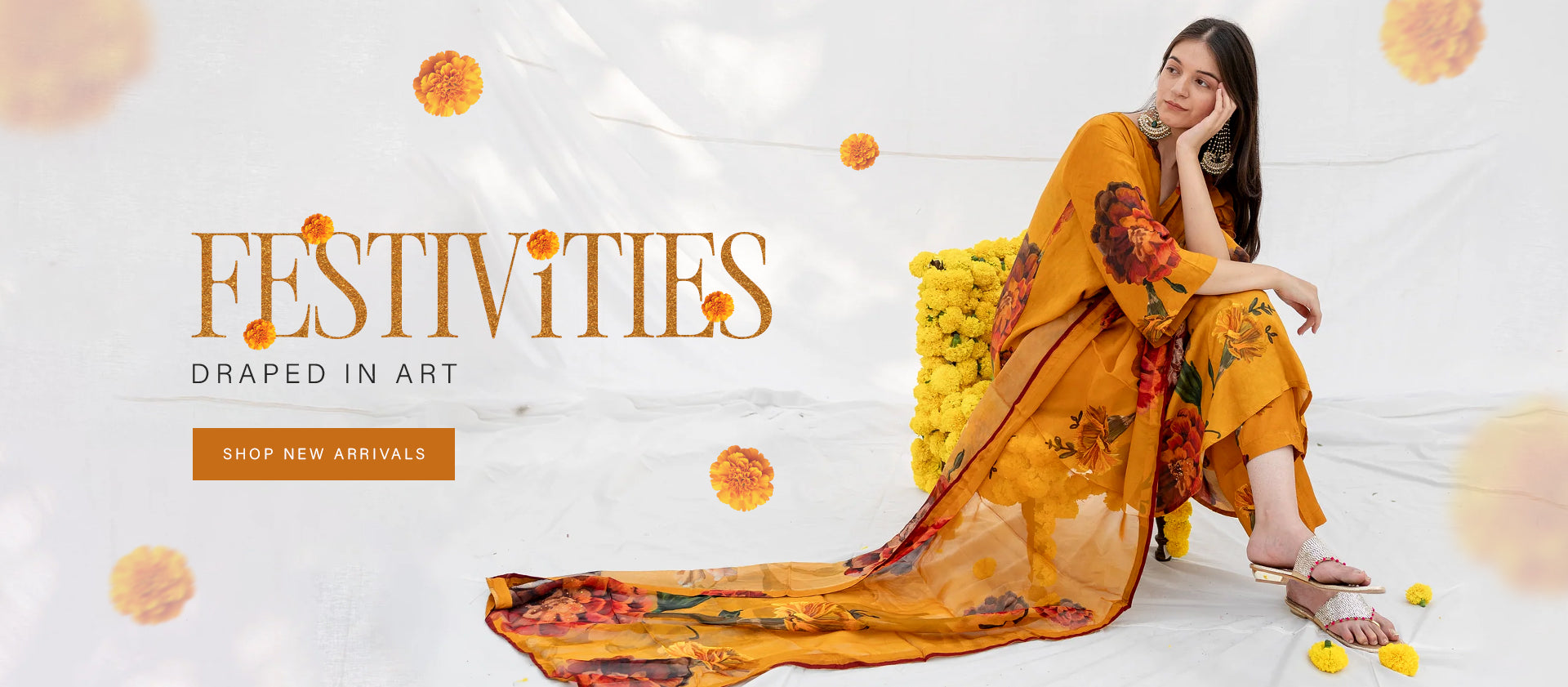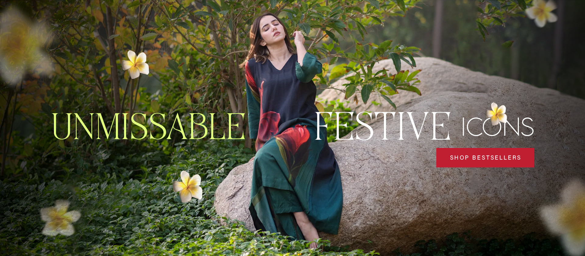 Our festive pieces bloom with intricate floral prints, elevated by delicate hand embroidery that celebrates timeless craftmanships
